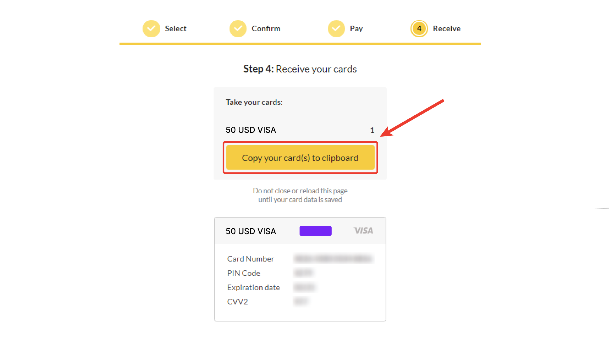 Once you receive your card data, click the 'COPY YOUR CARD(S) TO CLIPBOARD' button to copy and save them in a secure place!