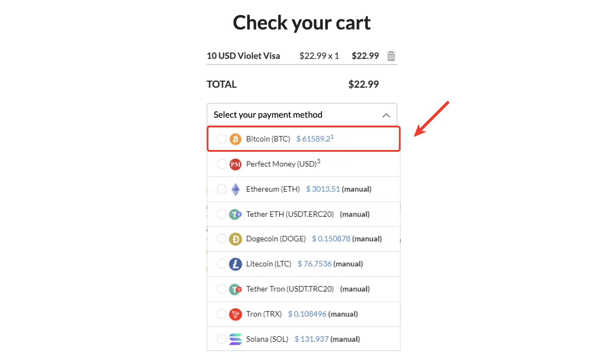Select the cryptocurrency you want to pay with (In our example, Bitcoin).