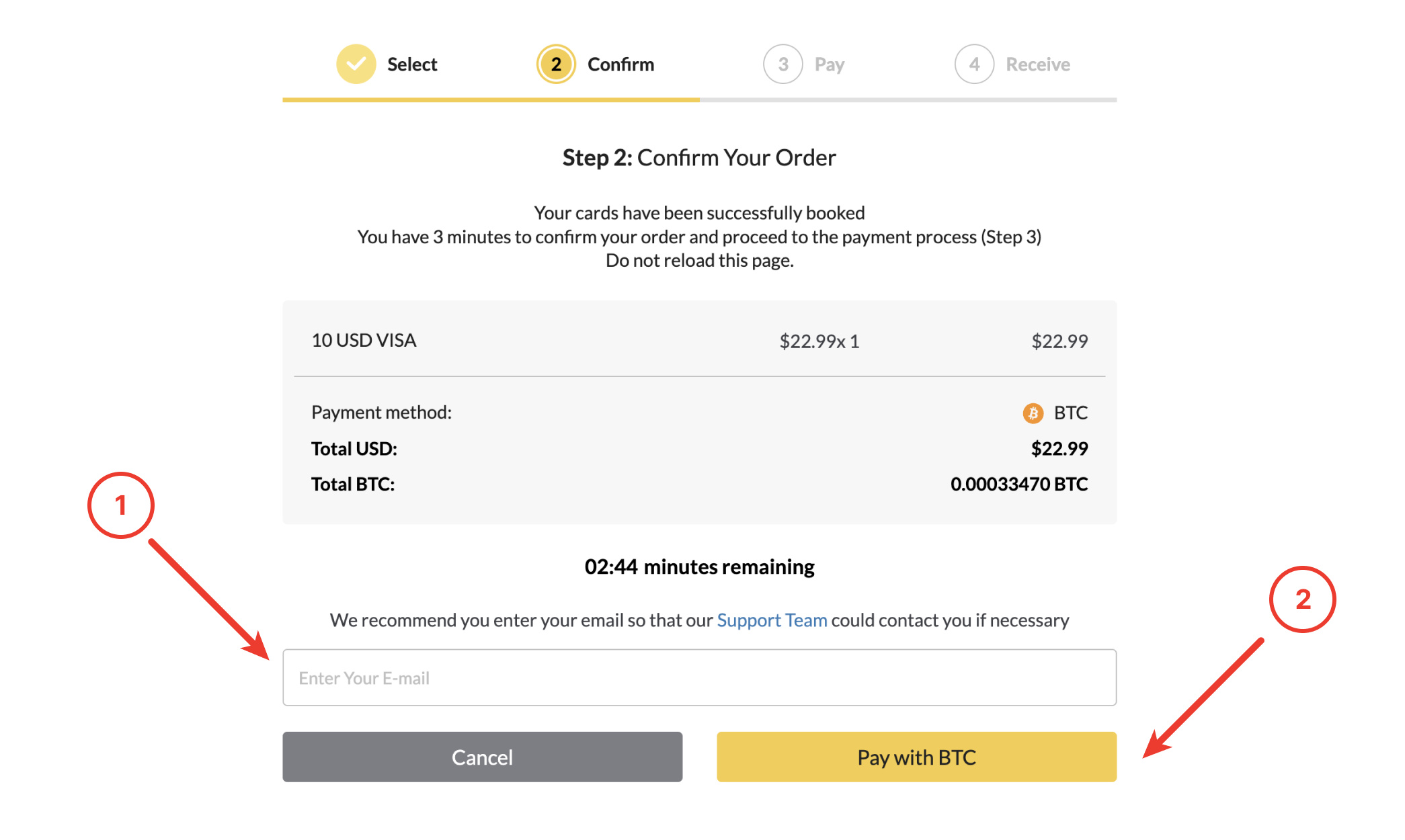 Please check your order again, enter your email address and click 'Pay with ...', depending on the cryptocurrency you have selected (In this example, 'Pay with BTC').