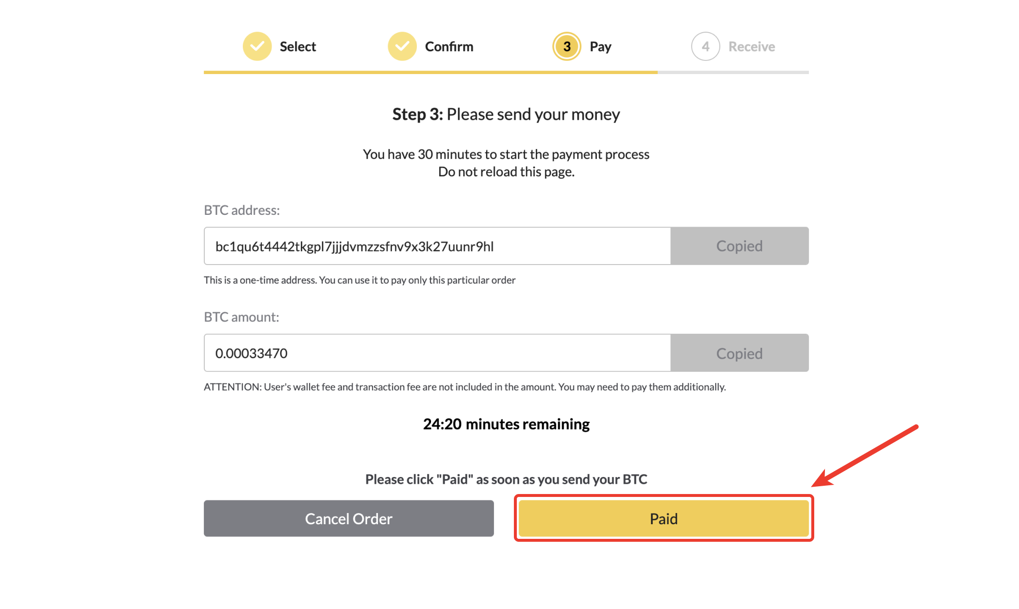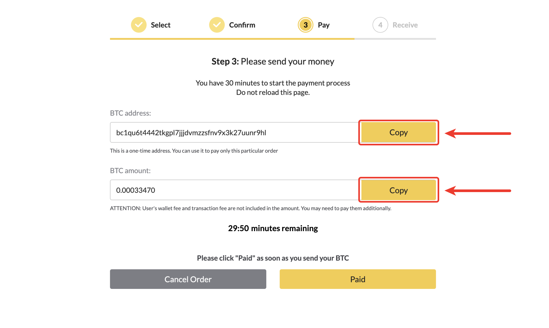 On the payment page, you will see a Bitcoin address and the amount of BTC to be sent to this address. Use the 'Copy' buttons to copy the BTC address and amount.