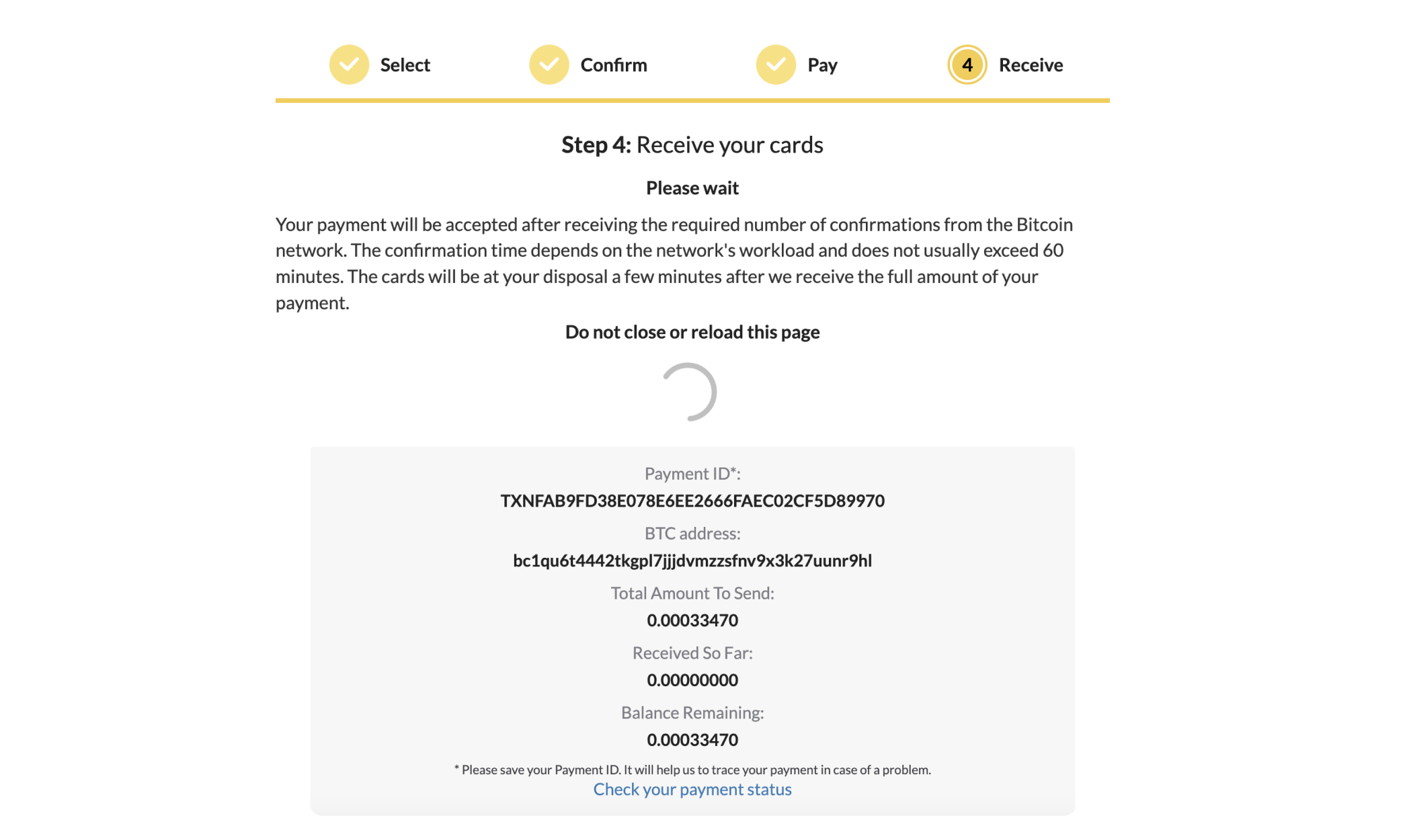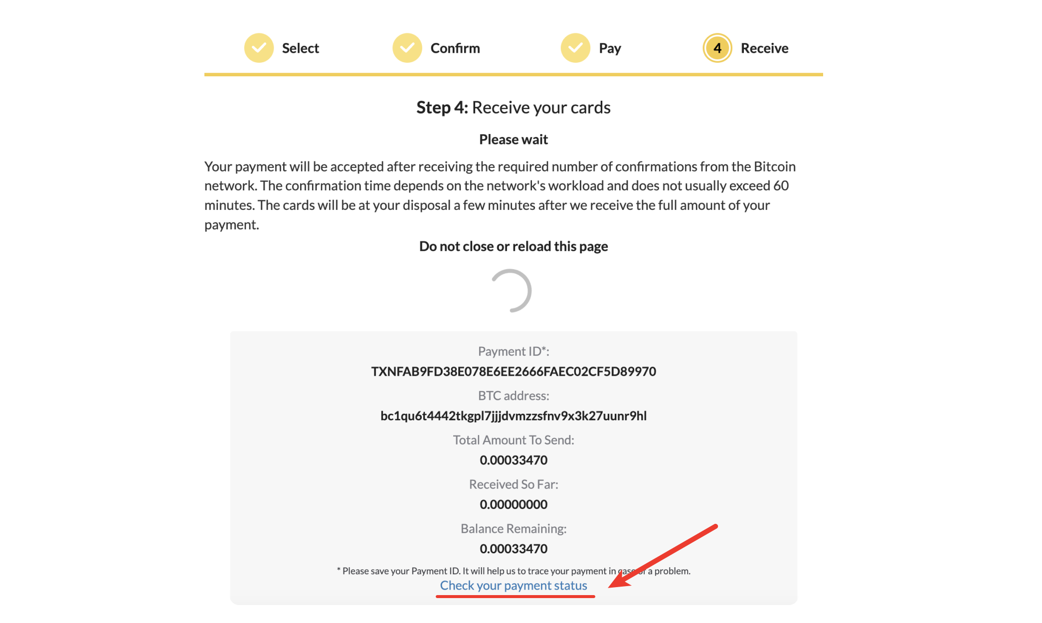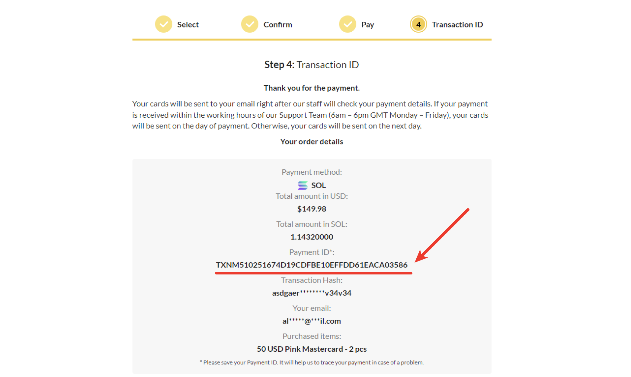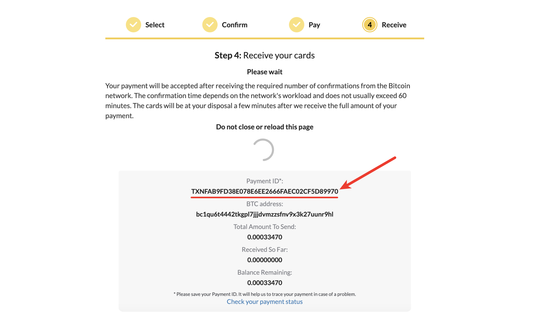 On the Payment ID page, you can see the details of your payment. We recommend you copy your Payment ID to be able to report it to our staff in the event you have not received your cards on the next day.