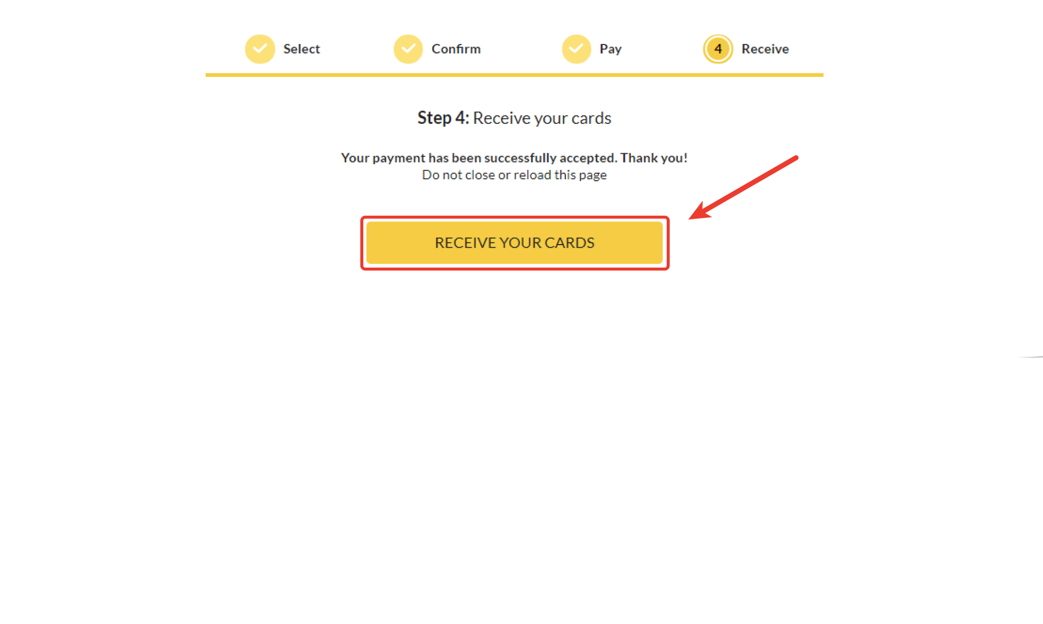 As soon as your payment is accepted, the 'Your payment has been successfully accepted' message will appear. Please click the 'RECEIVE YOUR CARDS' button to collect your order.