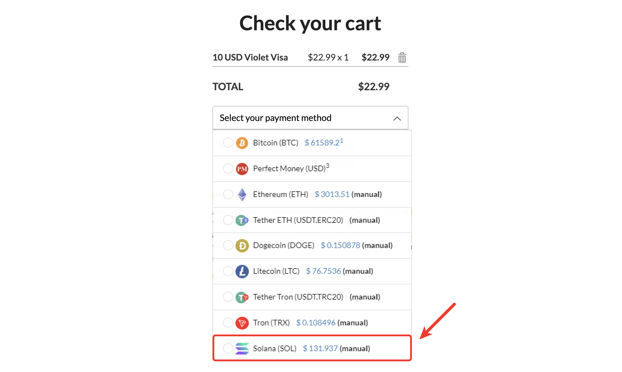 Select a payment method implying a manual mode (in this example, Solana (SOL))