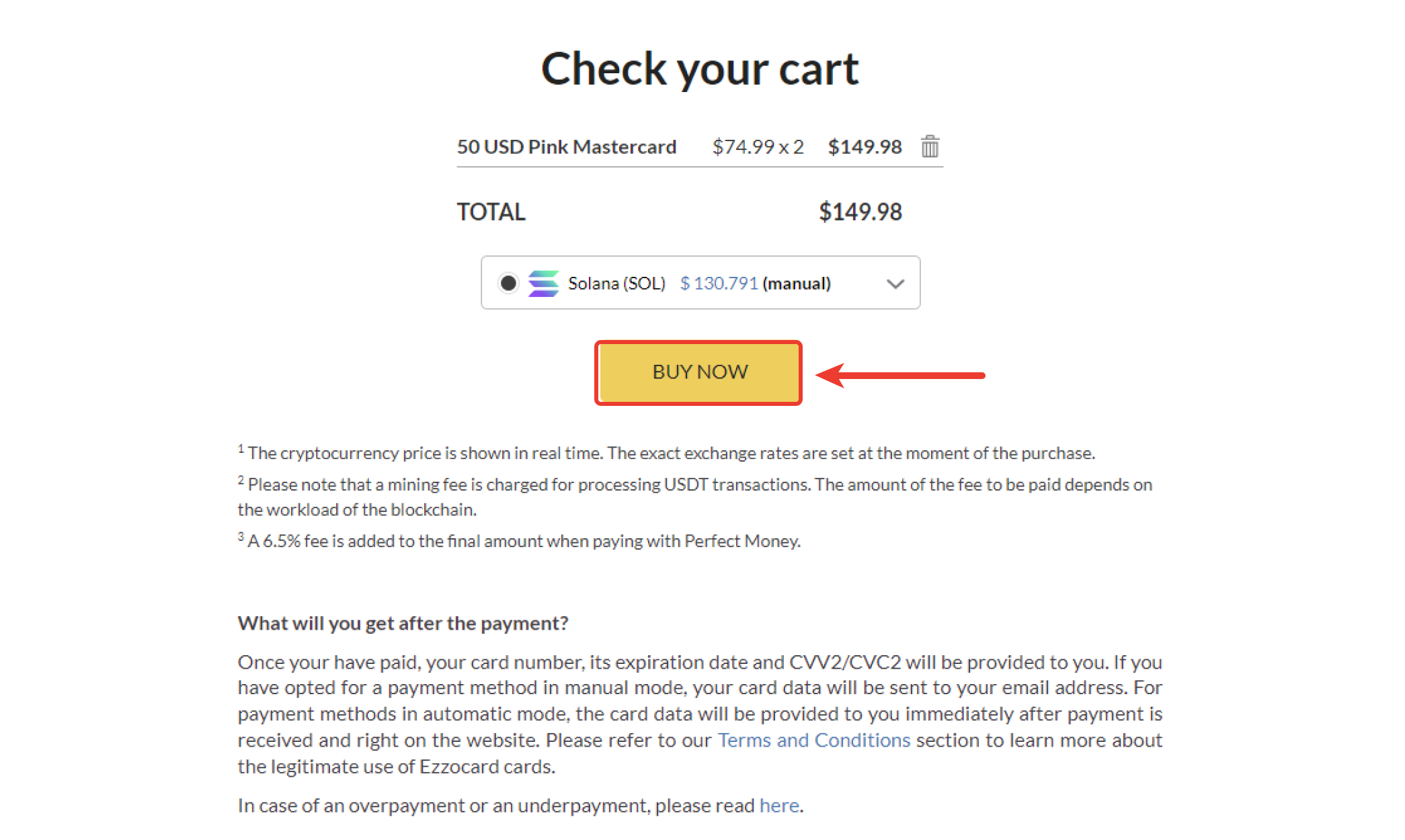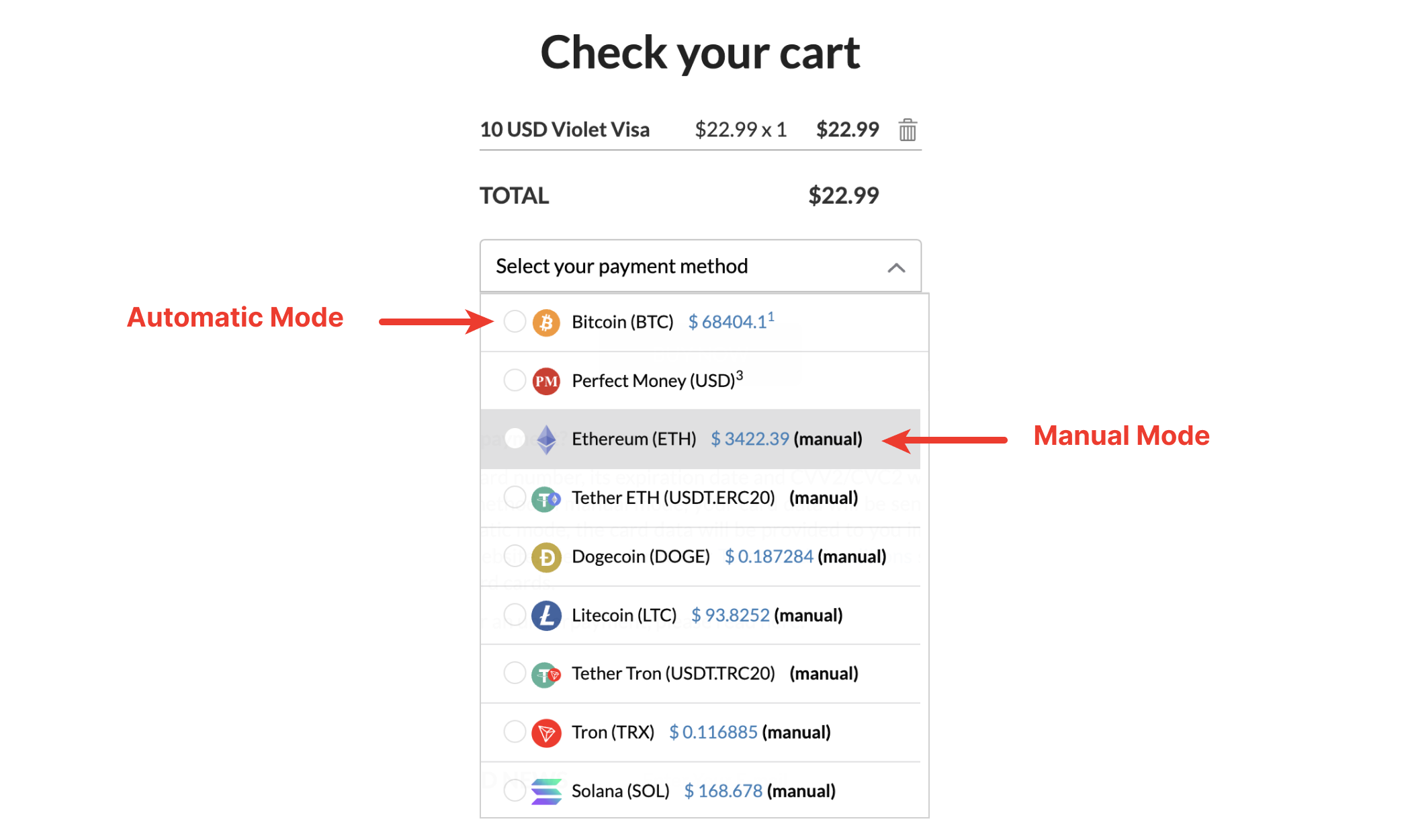 Payments on ezzocard.cc can be carried out in two modes '- automatic and manual, depending on the payment method you opt for. You can check if your payment will be handled manually or automatically when you select a payment method in your shopping cart '- the cryptocurrencies that are accepted in manual mode are labeled as 'manual'