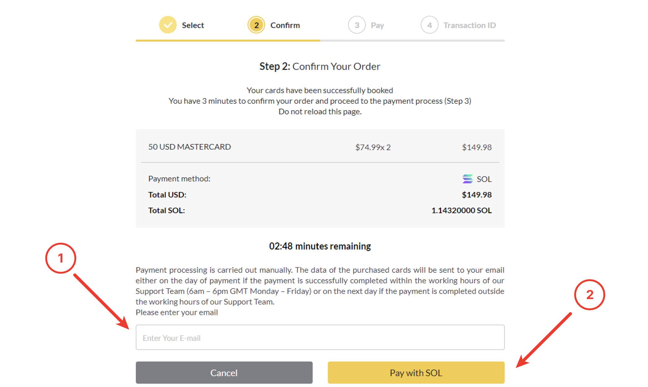 You have 3 minutes to proceed to the payment. Please check your order again, enter your email address and click 'Pay with...' depending on the cryptocurrency you have selected (in this example, 'Pay with SOL').