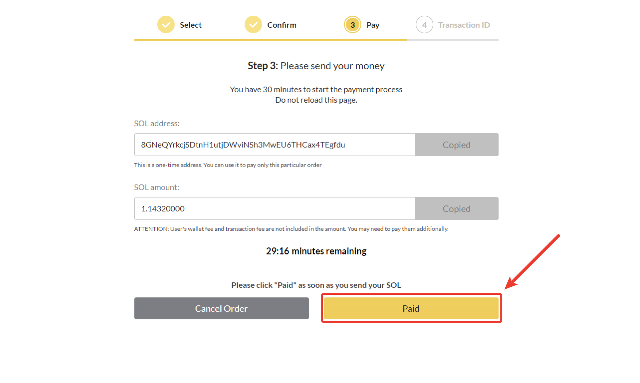 On the payment page, you will see a cryptocurrency address and the amount of the cryptocurrency to be sent to this address (in this example, SOL). Use the 'Copy' buttons to copy the address and amount.